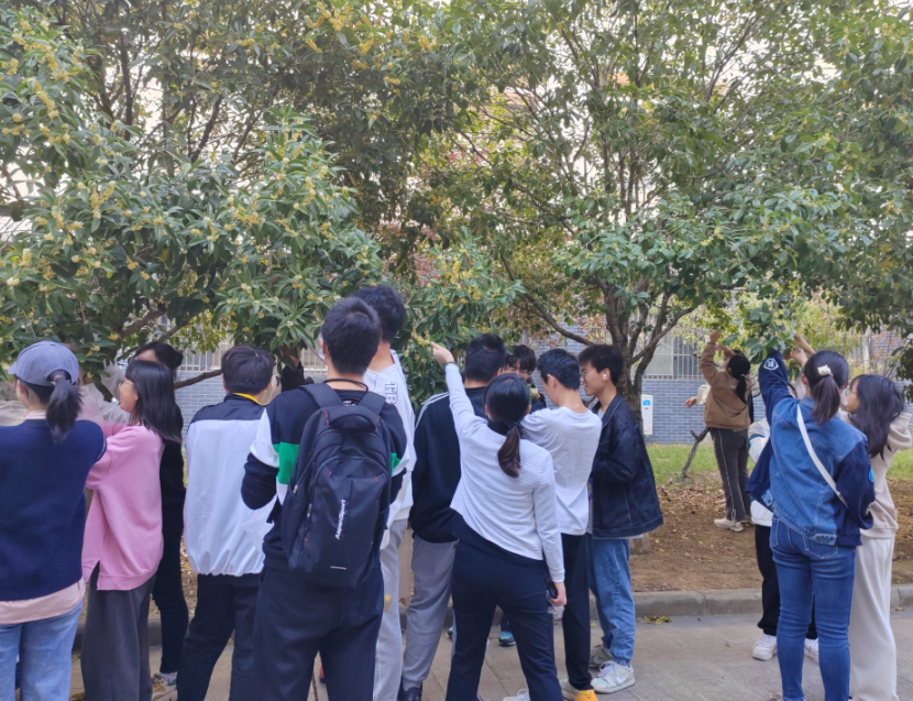 在食品科学学院贲爱玲教授的带领下,学生们近距离了解桂花,认识到桂花分为花色金黄的金桂、淡黄的银桂、橘黄的丹桂、一年开花数次的四季桂的知识,聆听了桂花树的生长过程、对环境的要求、桂花的用途等专业讲解,细心观察桂花的形、色、状态,用笔用眼用镜头记录下桂花之美。
