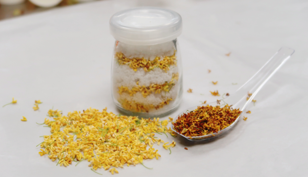 食用桂花选择金桂最佳,然后是银桂,最后才是丹桂。在认识了桂树的品种以后,同学们在不同种类的桂花树上采摘桂花。为了让这份秋天的馈赠留得更长久、与更多的人分享,大家将采摘的桂花一半制成干桂花,一半制成糖桂花。同学们仔细挑除树叶杂质、洗净表面的灰尘,细细铺开后让阳光与秋风使其沉淀、升华。为了比较制作干桂花的最佳方法,同学们分小组尝试采用微波炉、烤箱、太阳晒、风吹等多种方法制作,后续加工成美味的桂花茶、桂花糕、桂花酒酿、桂花赤豆元宵等特色小食,品尝着劳动的喜悦。