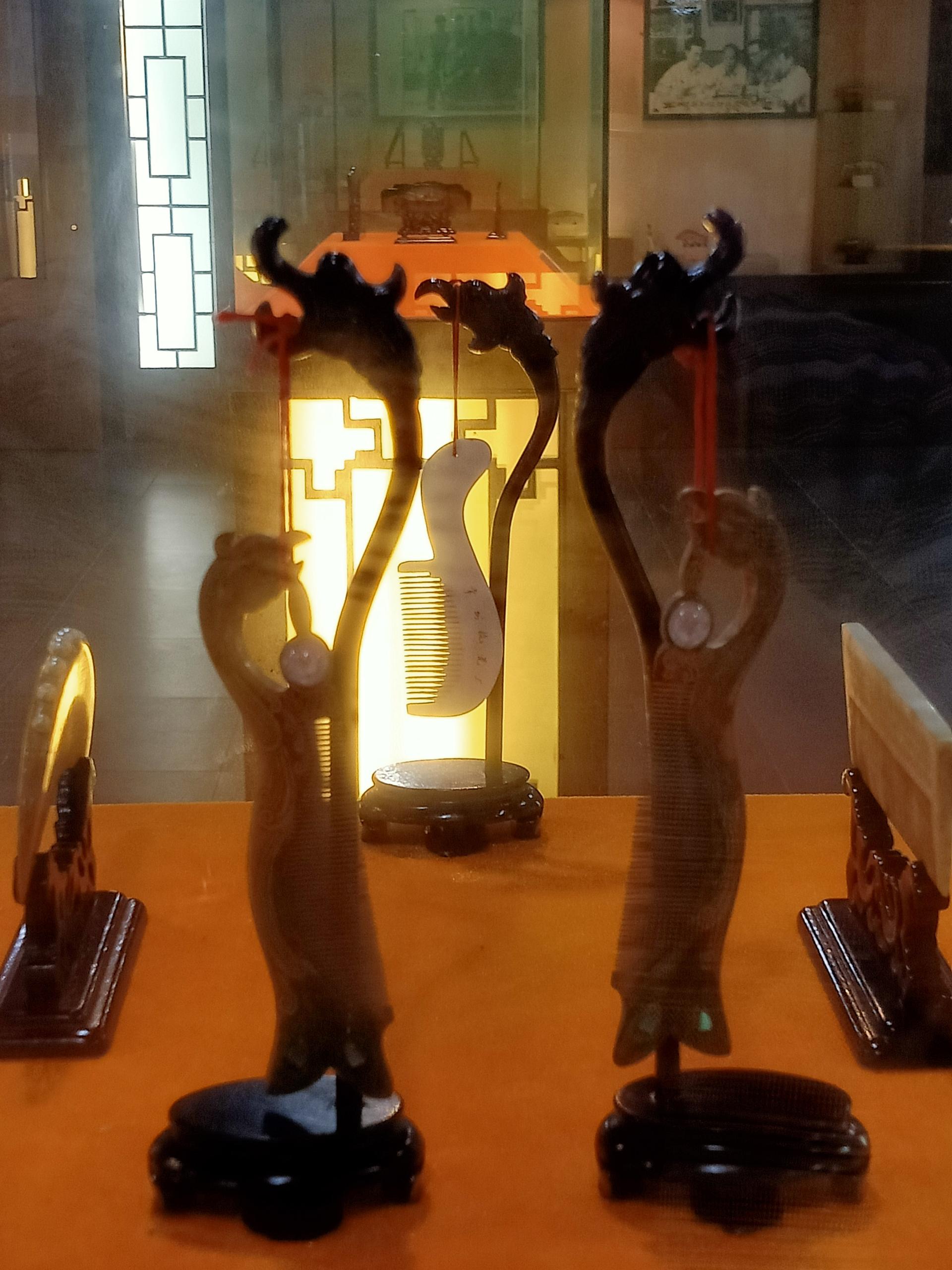 金厂长带领我们参观了梳篦博物馆的所有场馆,在各个展位面前向我们详细介绍了常州梳篦的历史、发展、传承和开发的情况。博物馆内陈列了历代珍奇梳篦和近现代梳篦精品,浓缩了常州梳篦千年工艺文化精髓,馆内还珍藏着众多关于常州梳篦的名家墨宝。他还带领我们参观了梳篦厂的生产车间,在这里我们了解到常州梳篦的制作工艺以及制作流程。团队成员和工人进行深入交流,进一步了解常州梳篦的有关情况。