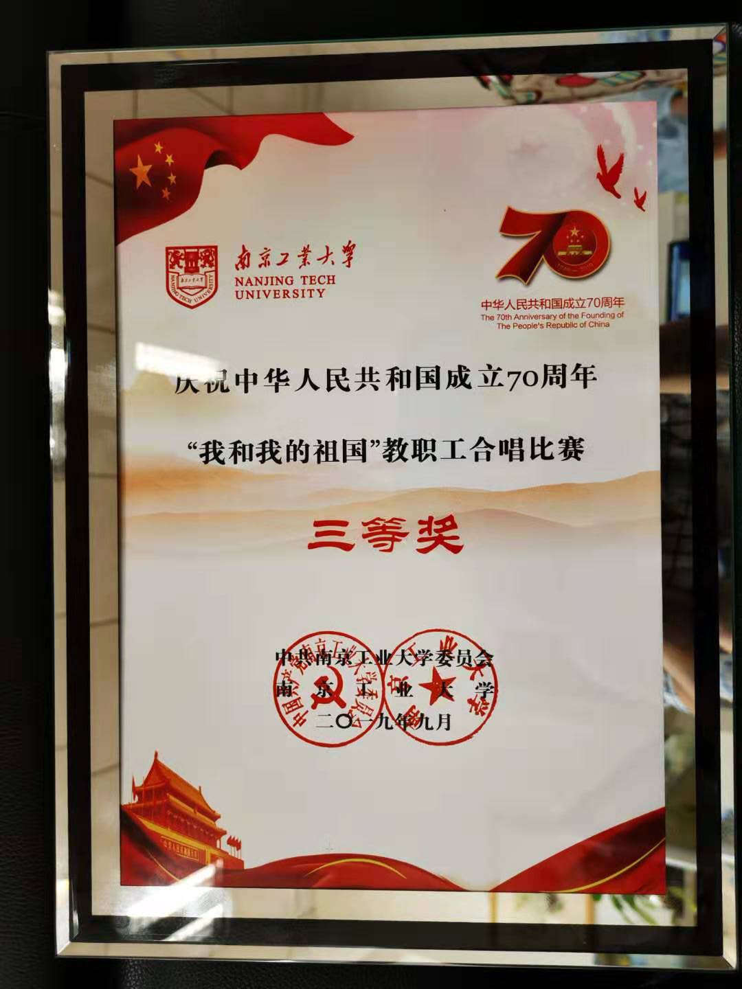 9月27日晚,我校庆祝中华人民共和国成立70周年“我和我的祖国”教职工合唱比赛在江浦校区大礼堂成功举办。我院与2011学院组成联队,共选派了50余名教职工登台表演,集体合唱了《没有共产党就没有新中国》,并获三等奖。