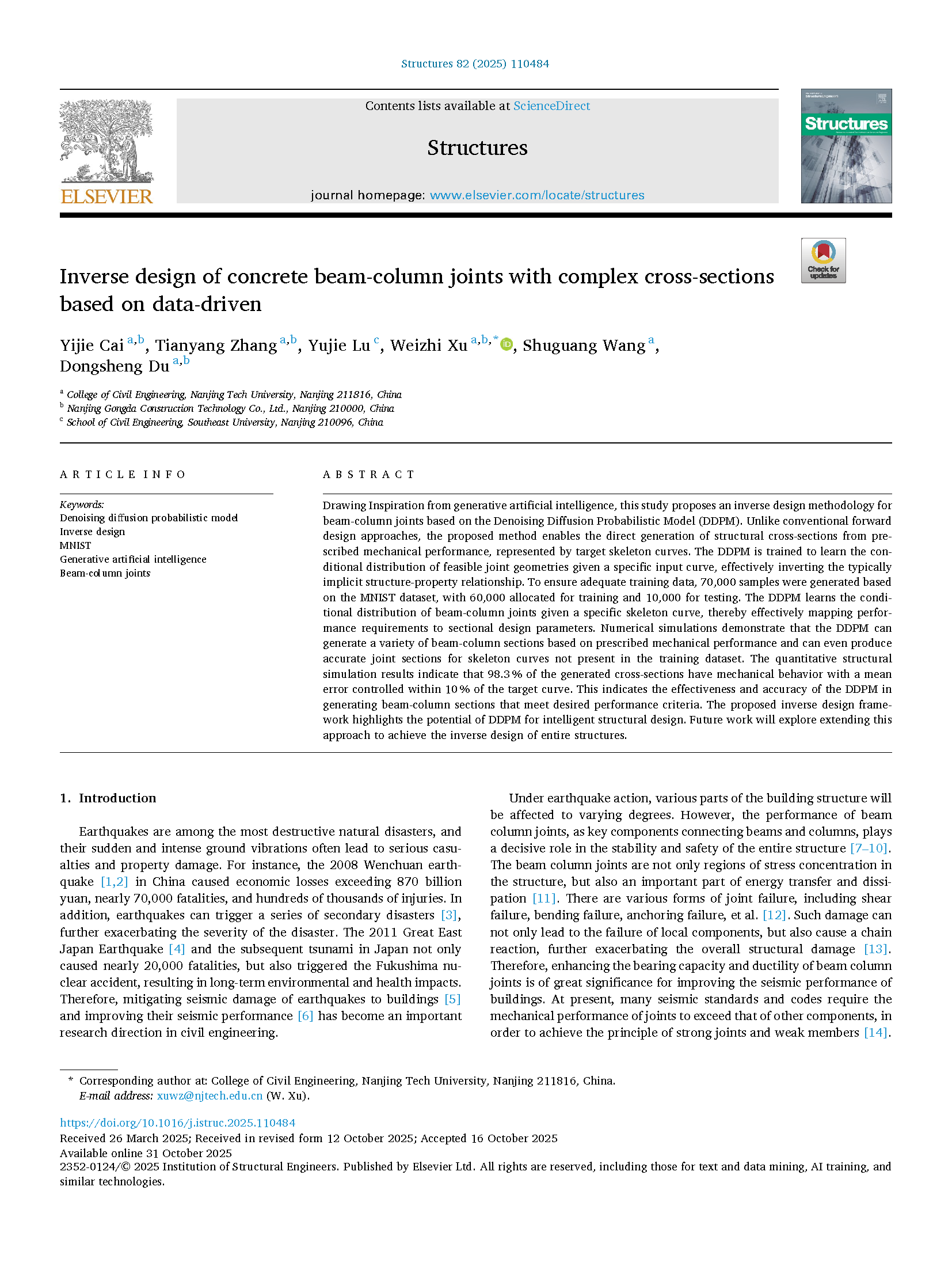 新利18彩票土木工程学院王曙光教授团队在《Advanced Engineering Informatics》、《Applied Soft Computing》、《Thin-Walled Structures》、《Engineering Failure Analysis》和《Structures》等国际权威学术期刊发表系列论文。论文成果涉及结构逆向设计、非结构构件损伤预测等多个领域,为解决复杂土木结构的性能导向设计与高效损伤评估提供了新的计算范式与研究思路,探索了生成式人工智能技术在结构工程领域的应用潜力。 在王曙光教授、杜东升教授和许伟志副教授的悉心指导下,团队紧扣“数据驱动”与“物理引导”两大核心,聚焦阻尼器微结构逆向生成、填充墙损伤快速反演等科学问题开展研究,取得了一系列成果。该五篇高水平学术论文第一作者分别为2023级博士生张天杨(前四篇)和2024级博士蔡亦杰(第五篇),新利18彩票为第一完成和通讯单位。 论文Ⅰ发表于《Advanced Engineering Informatics》(中科院大类学科:工程技术1区,小类学科:人工智能1区,TOP期刊,IF=9.9)。该研究针对分布式耗能钢板墙的阻尼微结构,提出了基于潜在扩散模型的逆向设计框架。通过引入拓扑变换网络将复杂的几何特征压缩,大幅降低了训练复杂度,并实现了从多目标非线性力学性能到可制造几何构型的精准“一对多”映射。试验表明,该框架生成的微结构在几何保真度和力学可靠性方面均表现优异。 论文Ⅱ发表于《Applied Soft Computing》(中科院大类学科:计算机科学2区,小类学科:人工智能2区,TOP期刊,IF=6.6)。该研究提出了基于物理信息引导的潜在扩散框架MultiDampGen,旨在生成用于地震能量耗散的多尺度、剪切主导型阻尼微结构。框架集成了特征压缩、滞回性能预测及物理映射模块,能够在满足多尺度和多目标承载力需求约束下,生成多类型微结构,有效支持了新型抗震耗能装置的创新设计探索。 论文Ⅲ发表于《Thin-Walled Structures》(中科院大类学科:工程技术2区,小类学科:力学1区,TOP期刊,IF=6.6)。该研究针对框架-填充墙结构的抗震性能提升,提出了一种基于自监督扩散模型的耗能钢板墙逆向设计方法。模型包含滞回性能预测与微结构生成两大网络,通过引入判别器和随机噪声进行迭代优化。研究证明,该自监督方法在生成周期性大规模复杂拓扑结构方面具有显著优势,能大幅减少有限元分析误差并精准达成力学性能目标。 论文Ⅳ发表于《Engineering Failure Analysis》(中科院大类学科:工程技术2区,小类学科:表征与测试1区,IF=5.7)。针对砌体填充墙难以兼顾损伤演化模拟与计算效率的难题,该研究开发了基于扩散模型的损伤反演方法。模型能够提取宏观层间变形特征,直接生成对应的损伤分布。本研究提出的损伤反演方法在拥有较快计算效率的同时具备较高精度,为非结构填充墙的全过程地震损伤分布的快速预测提供了高效工具。 论文Ⅴ发表于《Structures》(中科院大类学科:工程技术2区,小类学科:土木2区,IF=4.3)。受生成式人工智能启发,该研究提出了一种基于去噪扩散概率模型的梁柱节点逆向设计方法。不同于传统正向设计,该方法实现了从目标骨架曲线到结构横截面参数的直接映射。数值模拟表明,模型能生成多样化的梁柱截面,验证了该方法在智能结构逆向设计中的有效性。 秉持“开源共享、协同创新”的学术理念,团队已将上述系列研究的核心算法代码及构建的相关数据集在GitHub平台https://github.com/AshenOneme全面开源,旨在促进“AI+土木”交叉研究的交流,为全球同行提供可复现、可扩展的基准测试数据,共同推动生成式人工智能在结构工程领域的深度应用与生态构建。