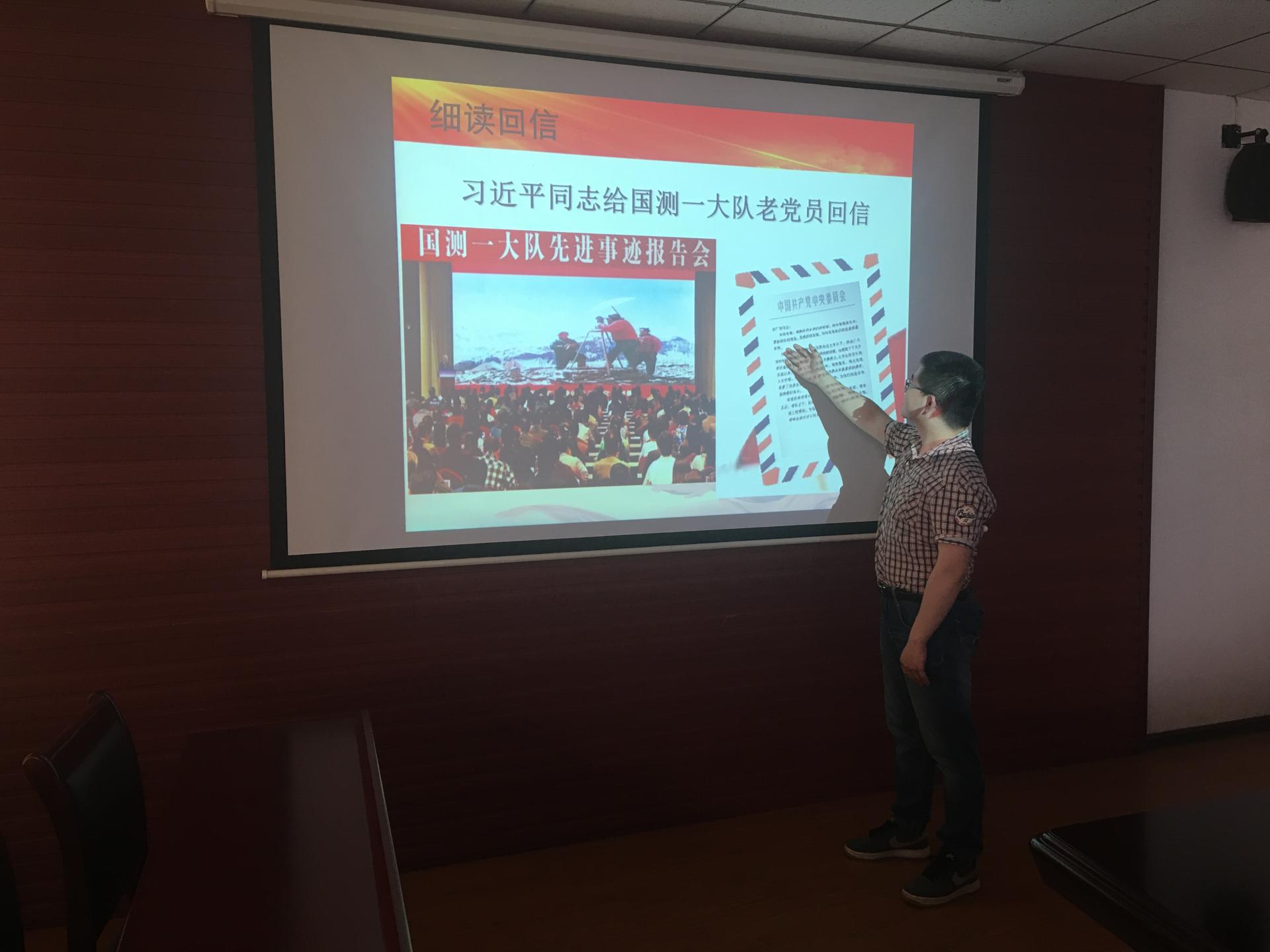 在“细读‘回信’模块里,党支部书记李连阳带着党支部全体成员仔细阅读了习近平总书记给国测一大队6名老队员老党员的回信,认真观看了国测一大队先进事迹相关视频。全体成员结合自身实际情况进行了热烈的讨论,纷纷表态要在科研学习的道路上不畏艰苦,砥砺前行。