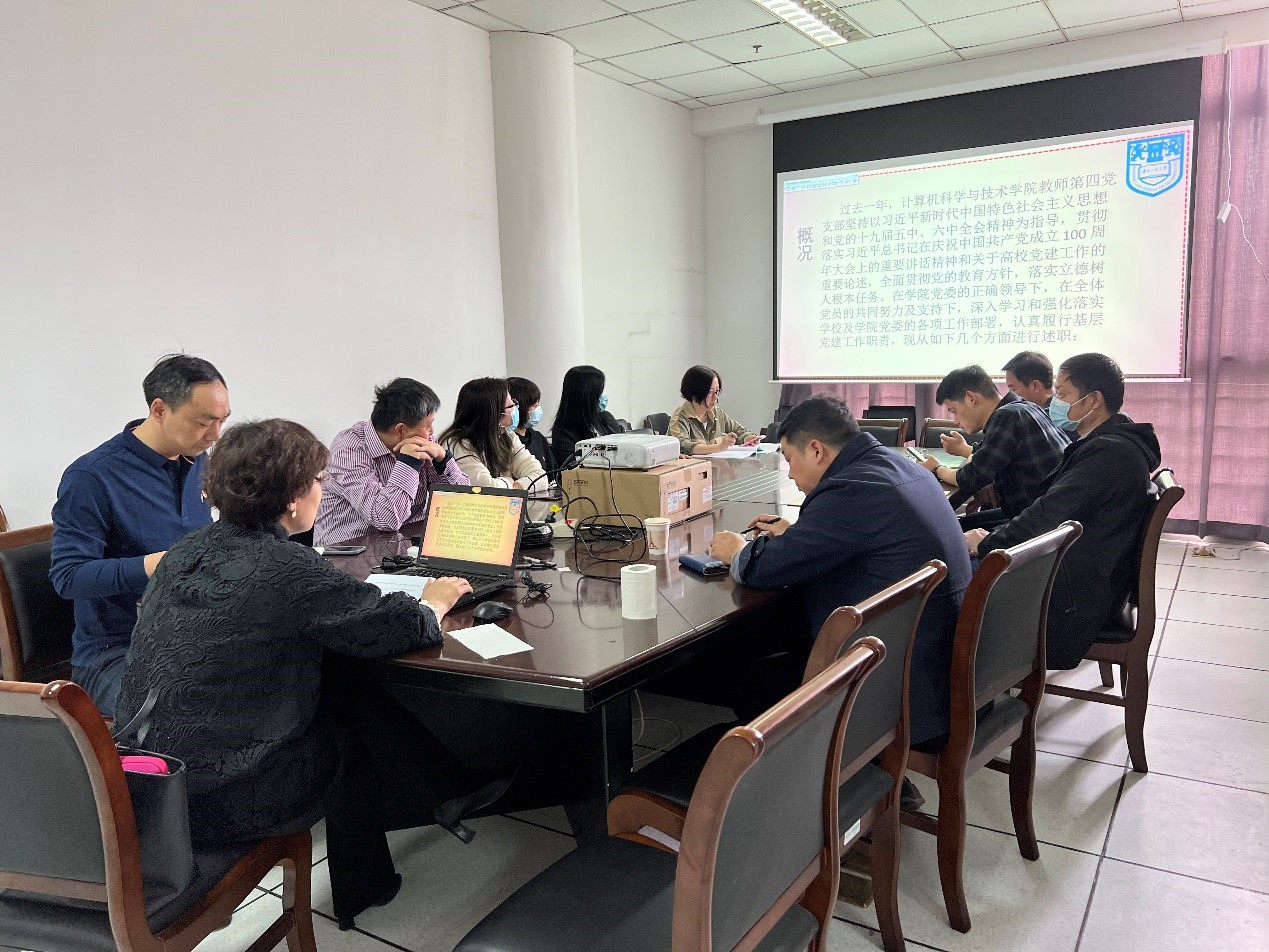 会议首先由刘军书记对2021计算机教师第四党支部工作进行总结。2021年,支部通过学习强化支部政治功能,坚定党员的政治信仰;通过扎实开展支部工作,提高党支部的创造力、凝聚力和战斗力;通过教学科研及公共服务,提升服务水平;通过问题导向,不断提高工作能力。
