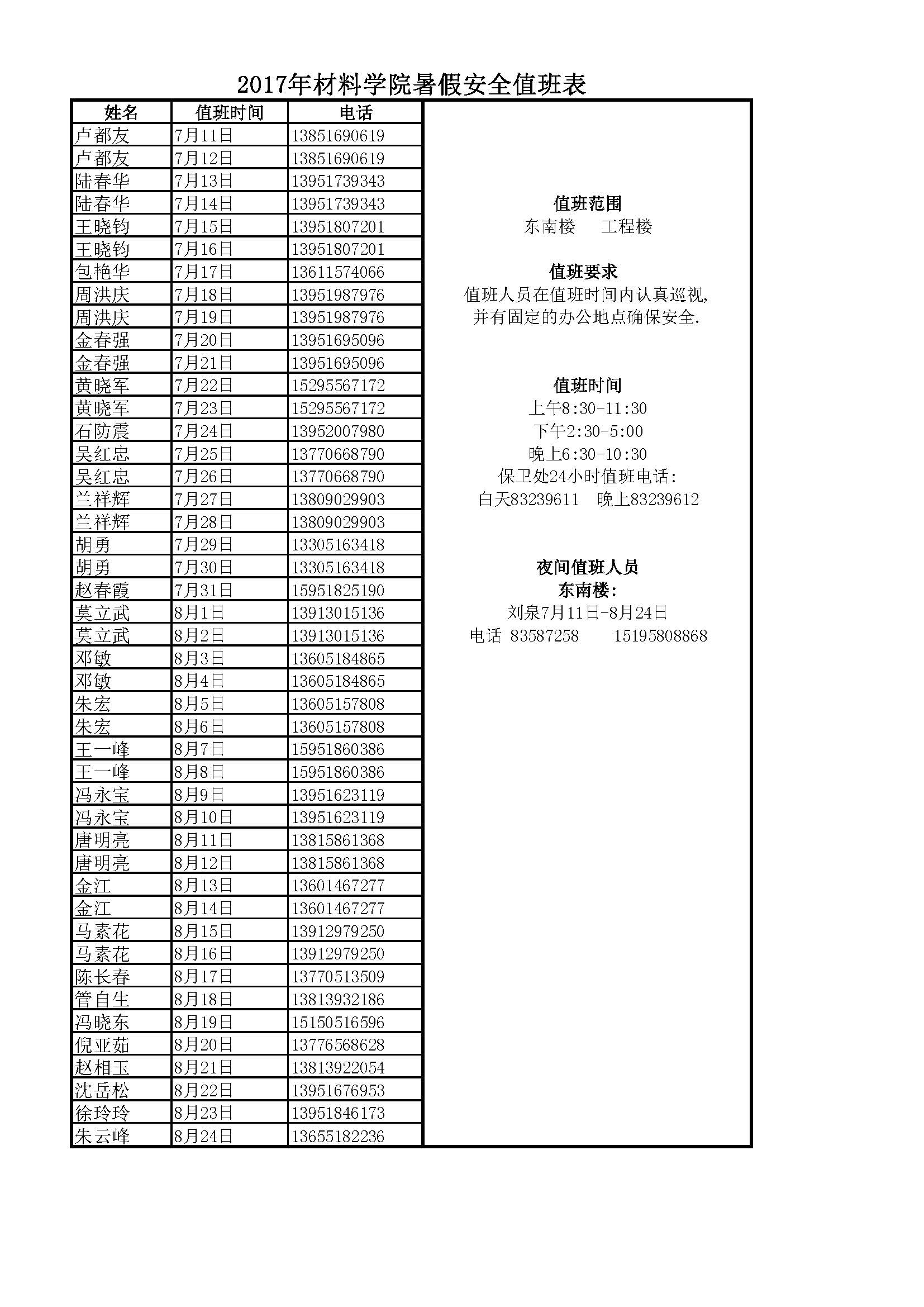 (三)各系、室、中心安排专人值班,确保内部工作的正常运转、对外联系的有序进行,做好暑期留校学生的学习、生活安排,值班安排表如下。