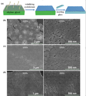 图1 (a)上转换纳米粉体界面自组装示意图及(b,c,d)不同尺寸的上转换纳米粉体自组装膜的场发射扫描电镜(FESEM)图。