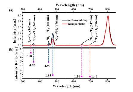 图2上转换纳米粉体自组装膜与无序粉体(a)在802 nm处进行归一化处理后的上转换荧光图及(b)相应的强度比。