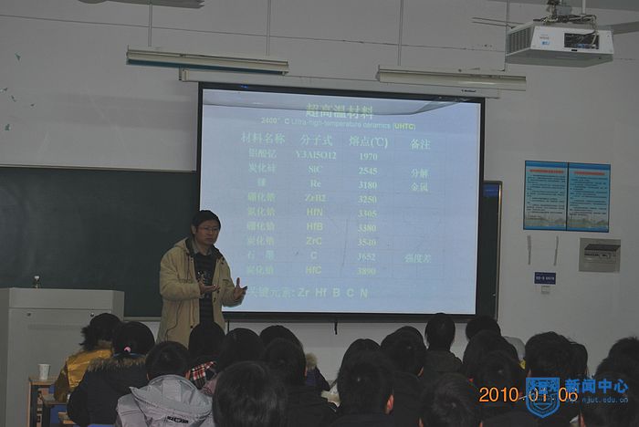 讲座中,郭教授就无机材料这一学科的前沿热点领域作了详细的解读,涉及到材料极限状态的研究,包括超硅单晶、超高温材料、智能材料的研究;材料设计——材料科学发展的终极目标、纳米材料与纳米材料的研究、光电子信息材料的研究、新能源材料的研究等方面。通过郭教授深入浅出的讲解,同学们进一步了解了材料科学的发展潜力,以及对科技发展和社会进步的巨大推进作用。同学们也对新型材料产生了浓厚的兴趣,比如:从未听说过的太空帆、金属橡胶、陶瓷弹簧等。郭教授拿出了课题组自主研制的纳米陶瓷刀具,让同学们近距离的接触新型材料,同学们更是兴趣高涨,纷纷前往观摩,感叹新型材料的神奇魅力。