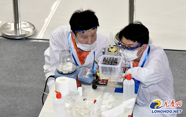 下午1点半,性能竞赛正式开始,在中国化工学会副理事长兼秘书长华炜公布490g和19.6m距离后,各参赛队进入实验区开始精确的计算、化学品称量、化学反应操作、设备的调试运行等,按照之前抽签顺序,各代表队的化学能小车陆续开跑。