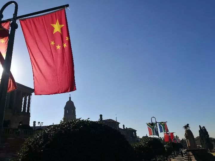 比勒陀利亚联邦大厦广场,草木葱茏。广场旁的大道上,中国和南非两国国旗高高挂起,迎风飘扬。