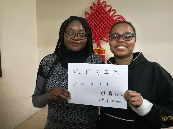 “虽然中文学起来很有挑战性,但这也恰恰是吸引我的原因。”姗妮和同伴维真向记者骄傲地展示她们书写的汉字:欢迎习主席访问南非!
