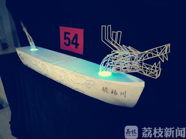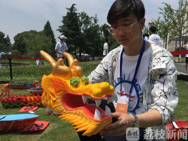 这艘黄金龙舟是新利18彩票 土木工程学院大一学生刘淼的作品,栩栩如生的龙头造型,是用泡沫雕刻而成。他从小对中国传统文化特别感兴趣,在对自古至今的龙的形象作了深入研究后,设计了这款造型。“这个龙的鼻子是我最先雕的,它像一个元宝的形状,代表着如意。之后就是龙角,它像鹿的角,代表一种吉祥。一个龙头最重要的就是龙角和龙眼,眼睛的话我用的是陆客。给他调出立体感来。”