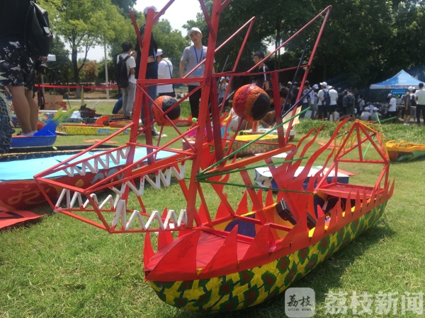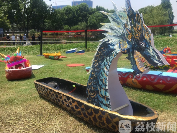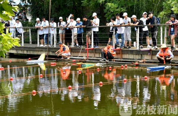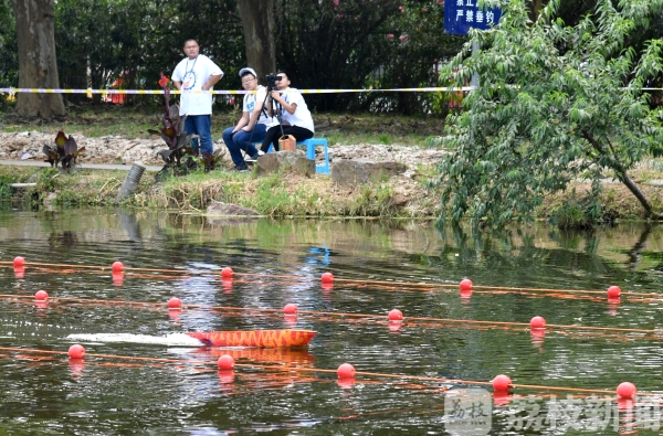 上午9点,新利18彩票 江浦校区君子湖畔杨柳依依,波光潋艳,56只用混凝土做成的龙舟和主人严阵以待。一声令下,只见一尾尾用或明黄、或朱红装裱得精美的龙舟在用浮标所规划出的航道上,劈波斩浪,冲锋向前,岸上的主人紧张有序地遥控着。