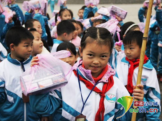图为黄丹学校学生展示自己领到的学习用品。谢金鑫 供图