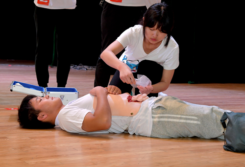 6支进入决赛的队伍除进行理论知识必答、抢答和主题演讲外,还围绕交通事故现场、地震灾害现场、火灾现场、踩踏现场、电击伤现场、运动伤害等六种场景进行技术演练。参赛选手在实现有效自我保护的基础上,根据所处场景和伤害事件应用适宜的急救技术,充分体现团队协作精神和对伤者的人文关怀。
