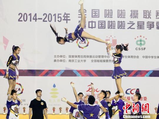 2014-2015年全国啦啦操联赛总决赛暨“中国啦啦之星”争霸赛总决赛此间在南京圆满落幕。在期6天的比赛中460余支队伍的5300多名运动员爆棚新利18彩票 (浦口校区)体育馆。(张子扬 摄)