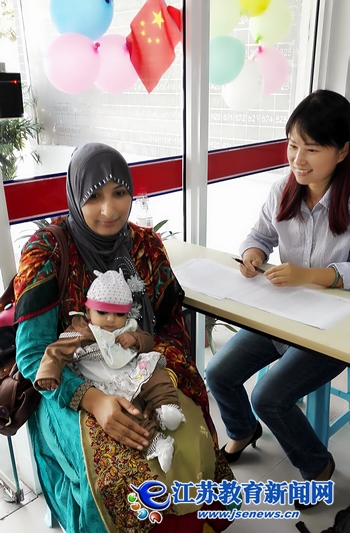 来自巴基斯坦的留学生带着四个月大的女儿前来报到