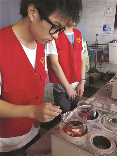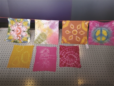和现在服装印染的方法不同,我国传统的染布手段其实是扎染。该校食品与轻工学院学生刘金凯告诉记者,扎染的第一步,其实就体现在“扎”这个字上。“我们需要将布块扎出我们需要的样子。”刘金凯拿出一块他们带来的麻布说。因为活动时间的限制,他设计了圆形的染色图案。扎完后,刘金凯将布块带到了配色台。“这次我们提供的是染料三原色,也就是红、黄、蓝三色。”选好颜色后,将扎好的布块放进染料烧杯,并放在下面放有60℃-70℃温水的恒温水浴锅里,就像给布块“泡澡”,在烧杯里再加上盐。“泡澡”大概半小时后,扎染就成功了。“之所以加盐,是为了固色。”