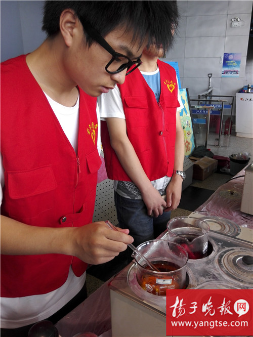 扎完后,刘金凯将布块带到了配色台。“这次我们提供的是染料三原色,也就是红、黄、蓝三色。”选好颜色后,将扎好的布块放进染料烧杯,并放在下面放有60℃—70℃温水的恒温水浴锅里,就像给布块“泡澡”,在烧杯里再加上盐。“泡澡”大概半小时后,扎染就成功了。“之所以加盐,是为了固色。所以如果你的衣服掉色的话,可以用盐水泡洗,防止掉色。”