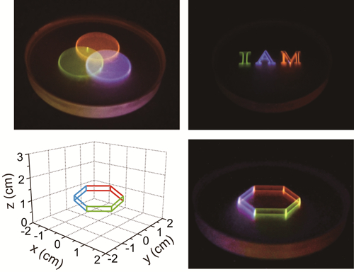 该研究负责人、中国科学院院士、有机电子与信息显示国家重点实验室培育基地主任、新利18彩票 校长黄维教授介绍说,传统的发光材料受限于固定波段、单一颜色发光,运用最广的二维彩色显示系统需要通过调控红、绿、蓝三种发光材料的颜色通道以及它们相互之间的叠加来得到彩色显示效果,这对加工工艺以及器件稳定性都有很高的要求,也限制了显示器分辨率的进一步提高。他们合作开发的透明无机纳米材料可以“全色”发光,不需要独立的红、绿、蓝三基色,每个纳米颗粒就是一个像素点,直接把分辨率提高到纳米级。更为重要的是,将这些在可见光条件下透明的纳米颗粒均匀分散在三维空间中,通过肉眼不可见激光的激发和调制,纳米颗粒可以发出多种不同颜色的可见光,从而实现真正意义上的真实立体彩色显示,并在空间三个维度都达到纳米级的极限分辨率,突破了传统显示方法,为立体显示技术提供了一条革命性的思路和途径,有着广阔的应用前景。