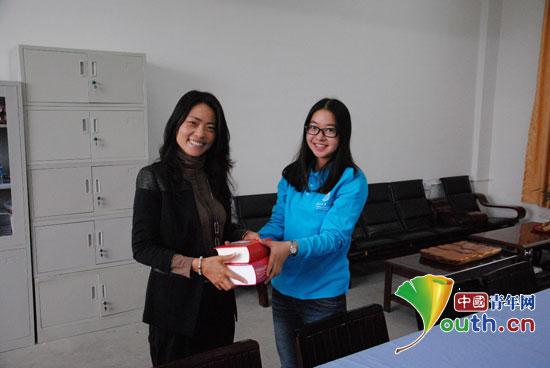 宁洱镇一中138班班主任赵红老师作为教师代表接受捐赠图书。