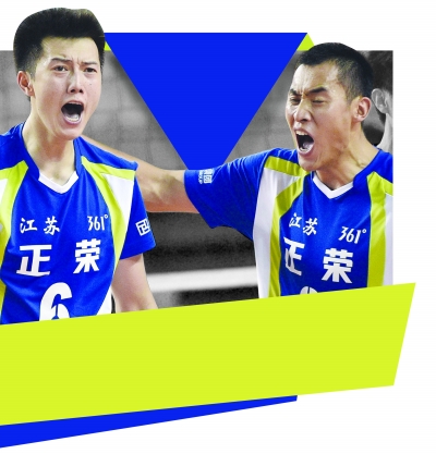 江苏正荣男排队长张晨(左)欢庆胜利。