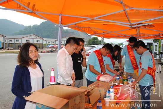 南工研支团在为过路前往灾区的志愿者提供泡面等食品