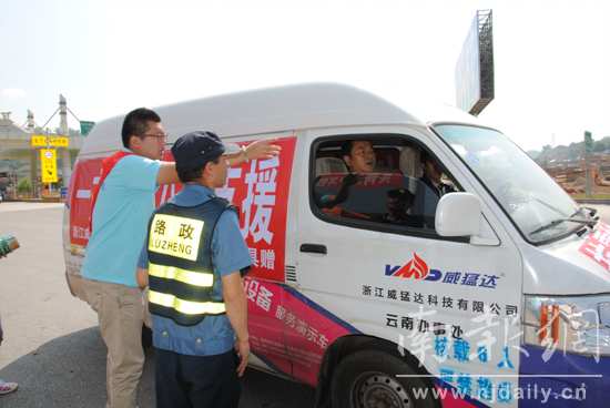 佟京达在给过路赈灾车辆指路