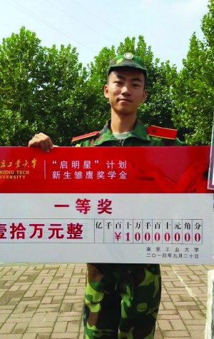 据南工大宣传部工作人员介绍,南工大于今年启动相关奖学金计划,省外新生高出当地省控线100分者即可列入一等奖名单,奖金10万。林大伟理科高考分高出贵州重本线105分,成为该校历史上第一位10万大奖获得者。