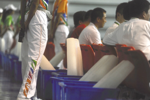 体育馆综合事务经理冷庆丰告诉记者,当初学校建馆时,只安装了两个空调机组,就是平时供学生使用。但按照亚手联要求,场内的温度必须维持在24℃左右。为此,在对场馆进行改造时,体育馆方面制定了两个方案,“一个就是在原先的基础上再安装空调,另外一个便是给场馆加冰块来降温”,冷庆丰这样说道。