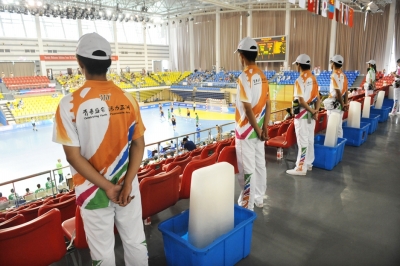 经历了雨水冲刷的南京“热”情不减,根据天气预报显示,昨天的最高温度依然达到了39摄氏度。不过走进承办手球比赛的南工大体育馆,一股凉意扑面而来。在二楼观众席的背后,放着200个盛有巨大冰块的蓝色水箱。加上室内的空调,馆内的气温只有24摄氏度左右,这里也是炎炎夏日中的“避暑胜地”。