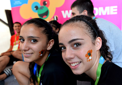 8月16日,来自巴勒斯坦的米拉尔·汉德尔(前右)与姐妹为晚上参加开幕式专门来到文化村绘制纹身贴画。新华社记者 李紫恒摄