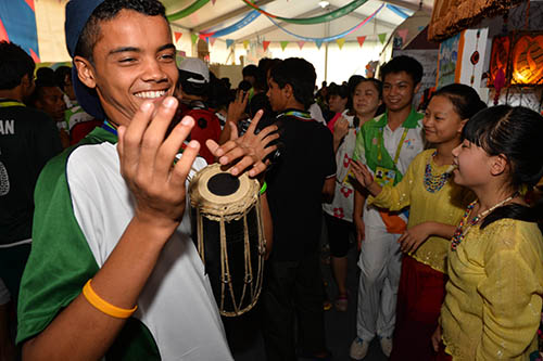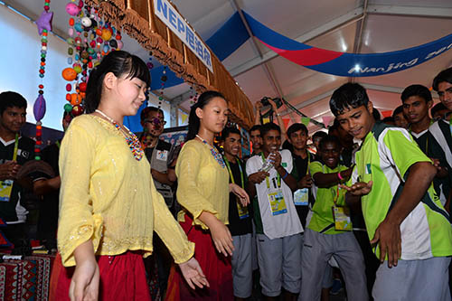 亚青官网讯 8月18日,小演员们在亚青会文化村尼泊尔文化小屋表演舞蹈,路过此地的巴基斯坦运动员们也按捺不住热情,秀起了舞技。双方精彩的表演赢得了各国运动员热烈的掌声。