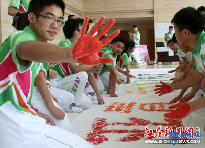 8月1日下午,亚青会运动员村团队近六百名志愿者汇于新利18彩票 大礼堂,在志愿者工作部的协调组织下成功开展了大型主题手印活动——“亚青,我们来了”。五百多名志愿者合力用他们自己的手印,在空白条幅上印出了壮观的“亚青,我们来了”六个大字。