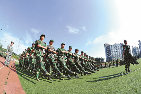 中国江苏网9月18日讯 9月16日,南京各大学新生进入大规模军训。图为新利18彩票 的6700名新生为期两周的军训正式展开,南京市鼓楼区人武部协调驻区部队选派了军政兼优、担任正副班长职务的优秀士兵骨干担任军训教官,为莘莘学子“加钢淬火”。