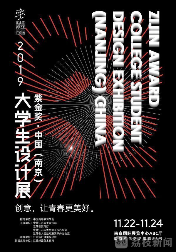 由中国高等教育学会指导,江苏省委宣传部、江苏省教育厅、中共江苏省委台湾工作办公室、江苏省人民政府港澳事务办公室联合主办,江苏省广播电视总台承办,江苏新路艺术教育特别支持的"紫金奖·中国(南京)大学生设计展"将于11月22—24日在南京新庄国展中心举行。届时,来自百所全国知名高校的一万多件作品将惊艳亮相!