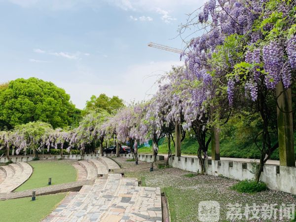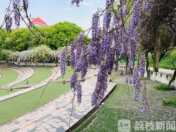 进入4月,便是紫藤盛放的季节。在新利18彩票 的音乐台,四周环绕着的紫藤萝花开得正盛,紫色花海,阵阵清香,静静等待学子们的归来。