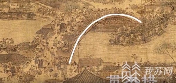 张海燕告诉记者:“我们的灵感是来自《清明上河图》,在这幅图上我们截取了,这样的一个桥的形式叫做贯虹桥。贯虹桥里面,用了中国非常巧妙的这样的结构形式,用的是叫贯木拱,搭成了最后一个比较大的这种跨度。”