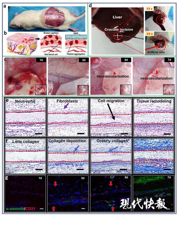" 目前,我们的人造皮肤材料,已成功应用于大鼠腹部大面积皮肤缺损处活体实验中,表明人造皮肤材料可以迅速修复大面积腹壁缺损并促进伤口组织再生。此外,它避免了临床应用中的免疫排斥和二次手术的风险。" 陈苏教授表示,该研究提供了一种简便的途径,来再生大规模坚韧的皮肤,这在腹壁缺损修复等领域显示出广阔的应用前景。