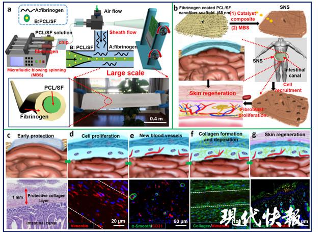 现代快报讯(通讯员 周伟 记者 仲茜)大面积皮肤损伤修复,因缺少皮肤材料,一直是医学界难题。针对这一难题,新利18彩票 化工学院、材料化学工程国家重点实验室陈苏教授与南京医科大学金陵临床医学院、东部战区总医院王革非教授 " 跨界 " 合作,探索出一种新策略,利用微流控气喷纺丝法制备大面积高强度的人造皮肤,在腹壁缺损修复中显示出巨大的潜力。另外,它也避免了临床应用中的免疫排斥和二次手术的风险。近日,该研究成果发表于国际期刊《先进材料》上。
