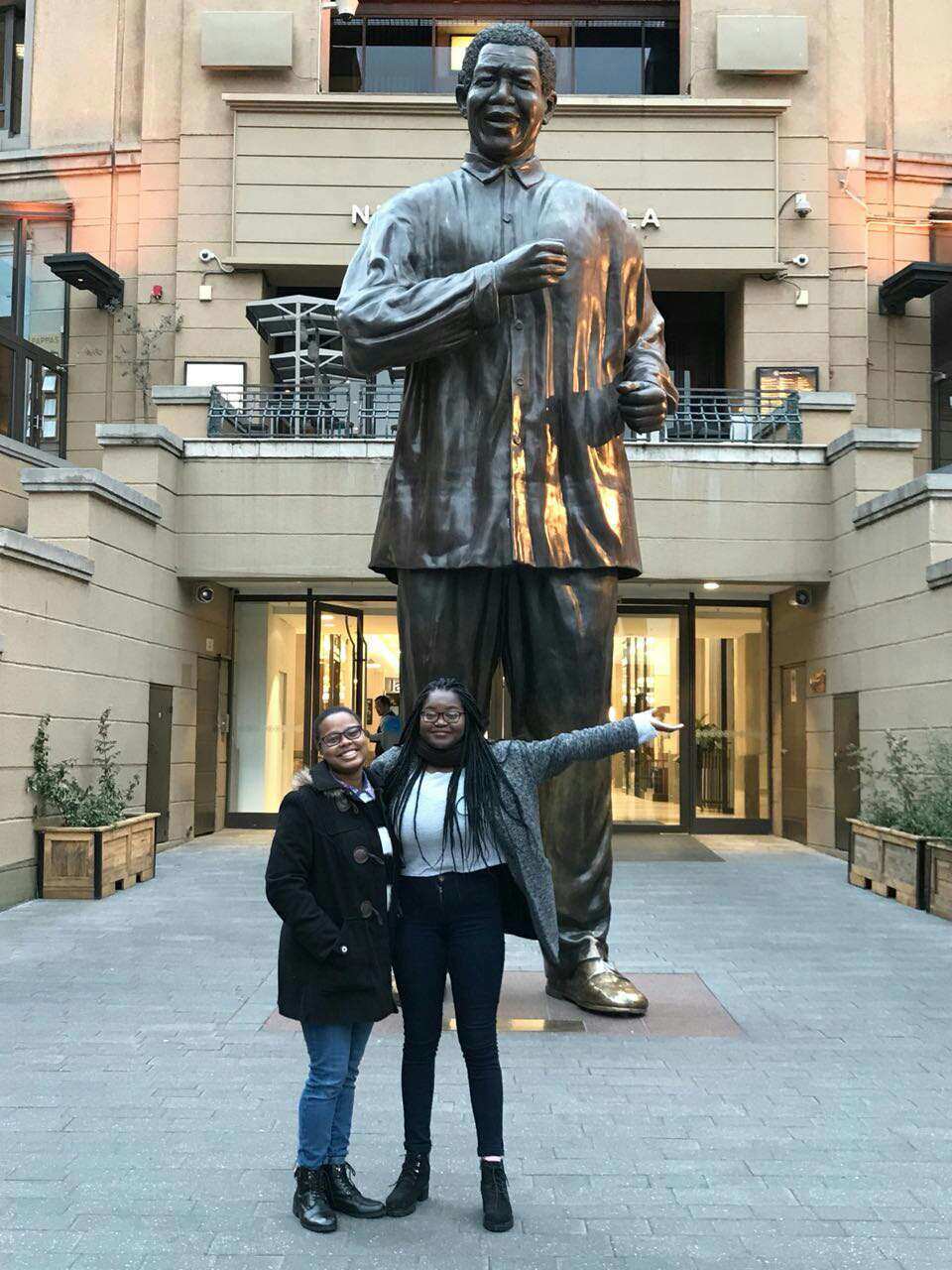 维真(右)与朋友在约翰内斯堡曼德拉广场曼德拉雕像前留影。受访者供图
