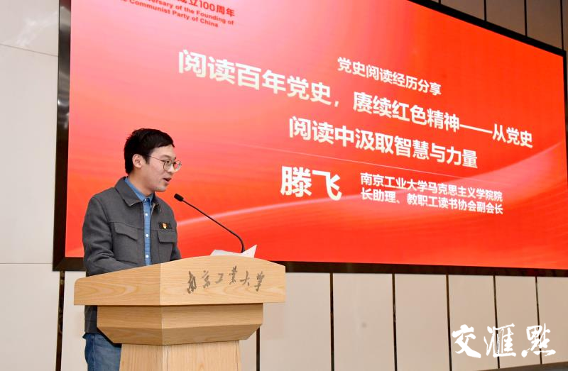 开幕式上,“新利18彩票 教职工读书协会”授牌仪式举行,教职工读书协会副会长、马克思主义学院院长助理滕飞与大家分享了《阅读百年党史,赓续红色精神——从党史阅读中汲取智慧与力量》。生长在书香世家、从小饱读诗书的滕飞说,自己最受益的还是三本书,其中《红岩》是他人生中阅读的第一部小说。“在百年党史阅读中,我们汲取了智慧、经验、精神和力量,这部小说,让才上初中的我深刻感受到了英烈们的爱国主义精神,至今读起,仍觉心潮澎湃。”现场,江北新区图书馆和南工大优秀读者代表还重温经典,庄严诵读 《共产党宣言》。