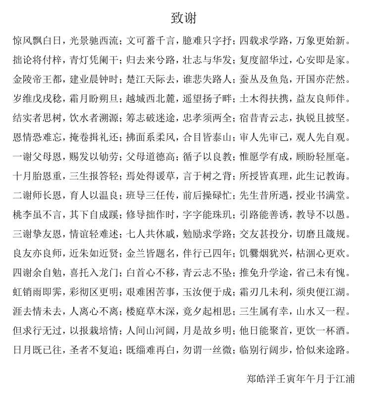 近日,新利18彩票 两名毕业生的古文体论文致谢刷屏朋友圈。机械学院博士毕业生刘喆和土木学院本科毕业生郑皓洋分别用1934字的古文和625字的古体诗,将求学经历和毕业感想娓娓道来,表达了对恩师、亲人和同窗等的感激之情。
