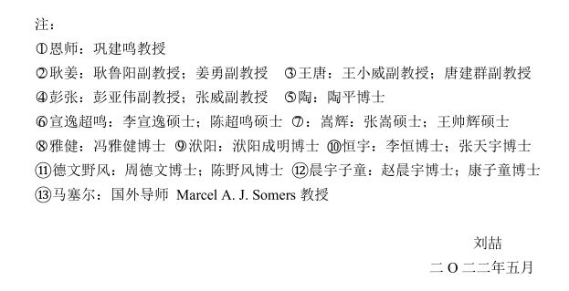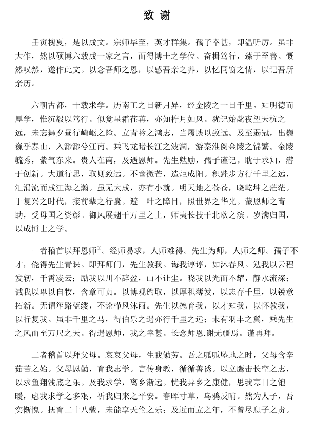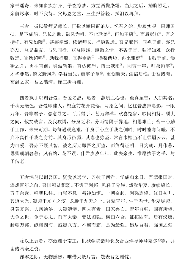 “一者稽首以拜恩师;二者稽首以拜父母;三者一揖以敬师兄师长,再揖以谢同窗弟友;四者执手以谢吾爱;五者深躬以谢吾国……”致谢中,机械学院2022届博士毕业生刘喆回忆了成长点滴,细数了导师、父母、师兄弟、同窗好友、女友等24位亲友对自己的帮助,以及祖国对自己的资助和影响,抒发了对他们的感激之情。