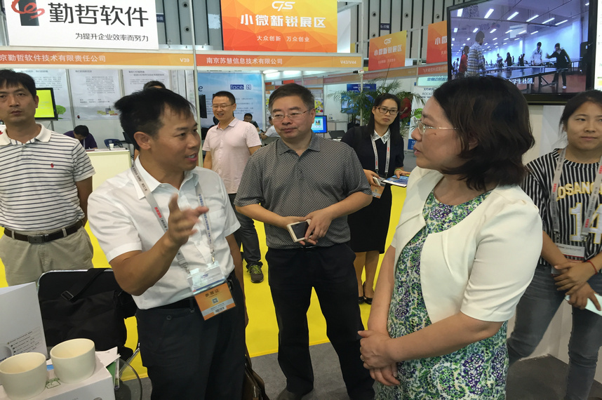 会议开始前,邢卫红副校长还来到第十一届中国(南京)国家软件产品和信息服务交易博览会的现场,饶有兴致的参观了我校互联网众创园的展台,详细了解了参展的产品及项目,并对参展工作提出了具体的要求。