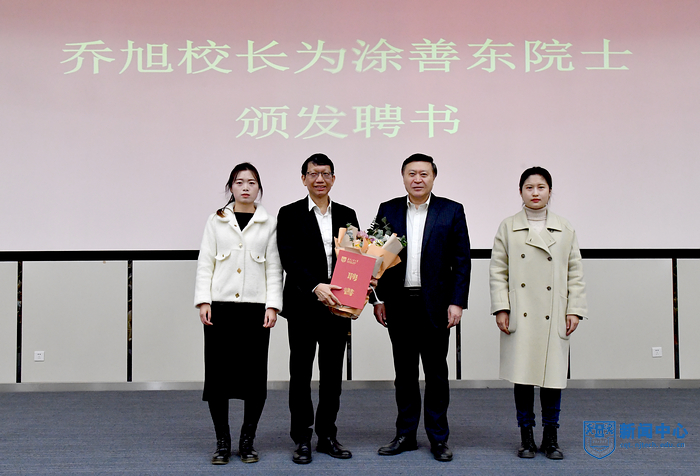 校长乔旭为涂善东院士颁发聘书、佩戴校徽