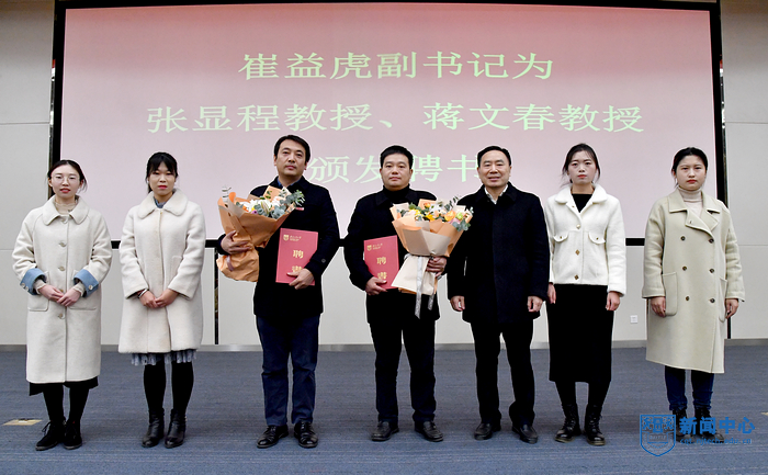 党委副书记崔益虎为张显程和蒋文春教授颁发聘书、佩戴校徽