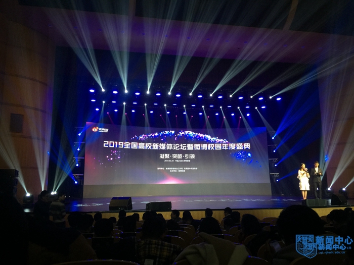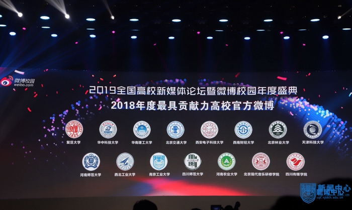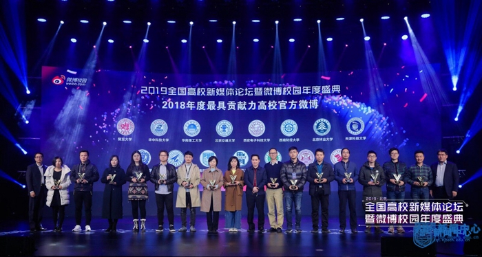 2月28日,由教育部思想政治工作司、共青团中央宣传部指导,新浪微博校园主办的“2019全国高校新媒体论坛暨微博校园年度盛典”在北京举行。本次活动以“凝聚•突破•引领”为主题,全方位探讨了高校新媒体发展的新趋势、新思路。中央网信办、教育部、共青团中央等单位相关负责人以及部分高校领导、老师、学生骨干等900余人参会。我校与复旦大学、华中科技大学、华南理工大学等共15个高校官方微博获得“2018年度最具贡献力高校官方微博”称号。