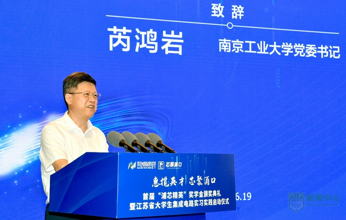 颁奖典礼上,芮鸿岩书记代表学校致辞。芮书记向与会领导嘉宾表示热烈欢迎,致以衷心感谢,并简要介绍了我校的历史沿革及办学特色;对集成电路实习实践基地的建成给予高度肯定,强调这将对学校高质量的人才培养、高水平的科学研究起到积极推动作用;希望获奖学生和参加实习实践的同学们珍惜荣誉、珍惜机会、刻苦学习、回报关爱,学校也将以此为新的契机,努力为浦口区集成电路产业的崛起壮大作出新的贡献。
