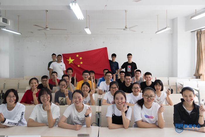 在班会现场,一片热闹欢腾景象,生物与制药工程学院250名2019级新生在辅导员施有禄和助理班主任的带领下,将“庆祝中华人民共和国成立70周年活动标识贴”贴在脸颊上,一面面鲜艳的五星红旗在室内展开。《歌唱祖国》《强军战歌》《国家》等一首首红色歌曲和爱国歌曲的旋律从教室里传出。学院2019级生物工程、制药工程专业9个班集体用红歌接力的方式上好开学第一课,献礼新中国70华诞。