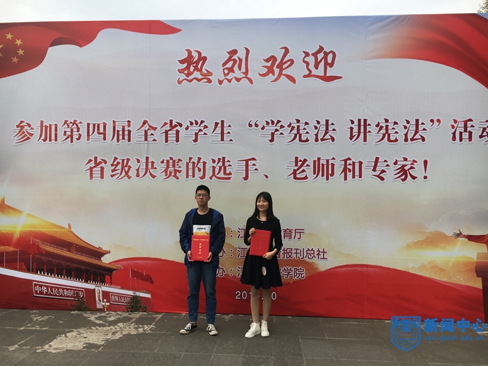 党的十八大以来,以习近平同志为核心的党中央着力推进全面依法治国,把实施宪法摆在全面依法治国的突出位置。根据教育部的统一部署,省教育厅开展了第四届全省学生“学宪法讲宪法”活动,比赛分为演讲比赛和法治知识竞赛。10月12日,胡月、郁程博两位同学从宁扬泰高校片区赛中顺利晋级决赛。演讲比赛决赛包括主题演讲和命题演讲两个环节,法治知识竞赛决赛包括知识考查和知识竞答两个环节。胡月同学在演讲比赛中落落大方、感情充沛、逻辑严谨,郁程博同学在法治知识竞赛中沉着稳定,表现优异,赢得了评委专家的肯定。